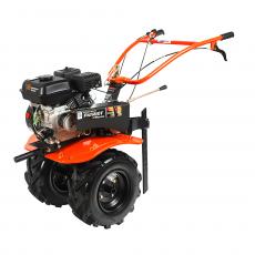 Калуга М X-Drive – модифицированный мощный бензиновый мотоблок с пониженной передачей и чугунным шестеренчато-цепным редуктором. Мотоблок оснащен четырехтактным двигателем с воздушным охлаждением. В комплектации закаленные фрезы, пневматические колеса с глубоким профилем протектора, сошник. Укрепленная рама с универсальной сцепкой позволяет установить дополнительное навесное оборудование или использовать вместе с тележкой. Первая пониженная передача улучшает проходимость мотоблока и позволяет без труда вспахивать тяжелые почвы. Кнопка включения, рукоятка газа и рычаг привода расположены на руле. Наклон руля регулируется.