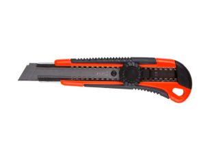 Тип корпуса: пластмассовый корпус, металлическая направляющая, обрезиненная рукоятка, винтовой фиксатор сменного лезвия и механизм автоматической фиксации сменного лезвия;