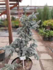 Медленнорастущее дерево высотой 10–15 м, пирамидальной формы, с плотными горизонтальными ярусами ветвей; хвоя светло-голубая, колючая. дымо- и газоустойчива. ... Стройное дерево родом из Северной Америки. Высотой до 15–20 (30–45) м, с симметричной конусовидной кроной.