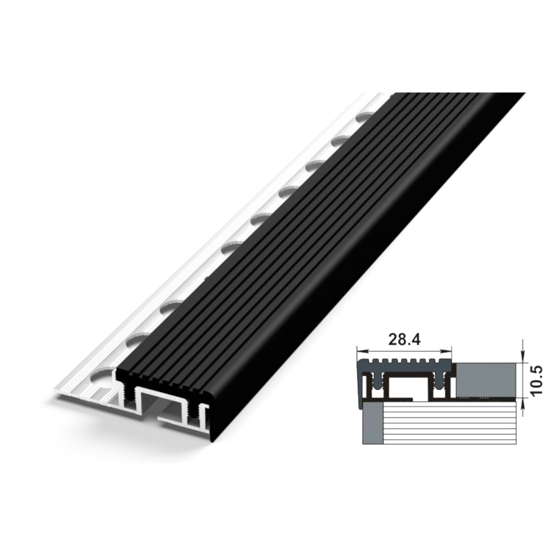 Алюминиевый внешний угол (накладка на ступень), 28.4 х 10.5 мм. Длина 2500 мм. C ПВХ накладкой на невидимой алюминиевой основе против скольжения и как элемент грязезащиты. Предназначен для защиты грани ступени. Устанавливается до момента укладки напольного покрытия на ступень, так как невидимая алюминиевая основа закладывается под напольное покрытие.