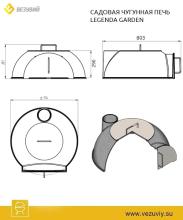 Чугунный купол печи Везувий Легенда Гарден полусферической формы. Верхняя часть купола «отсечена» и там расположена большая чугунная конфорка Везувий диаметром 400 мм. Конфорка съёмная, двухсоставная. Она позволяет разместить над огнём казан на двенадцать литров, сковороду или круглую решётку Везувий диаметром 38 см.